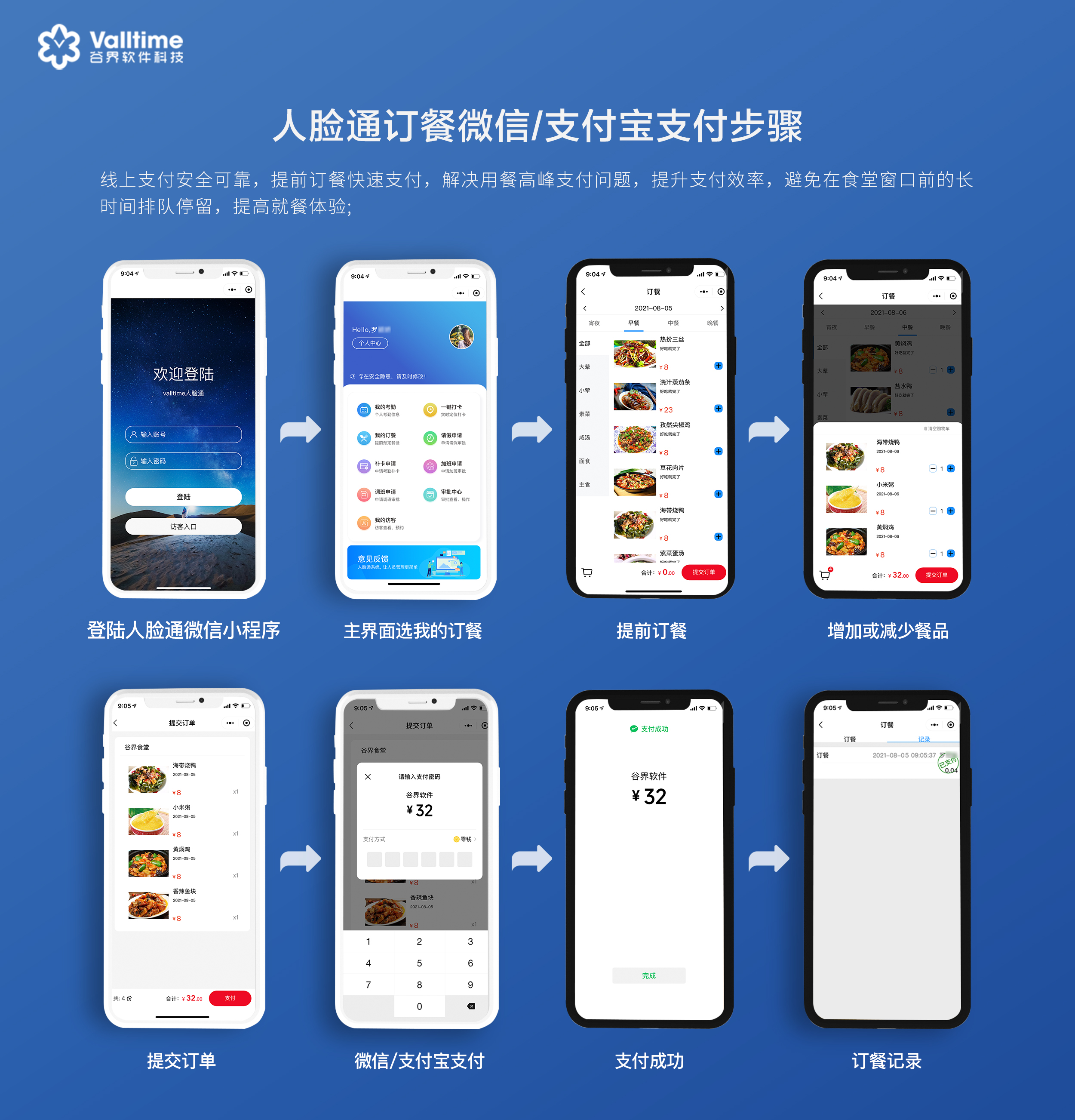 人脸通智慧食堂提前订餐微信/支付宝支付功能,为行业提供智慧食堂综合解决方案,全方位解决食堂用餐高峰期支付人员密集拥挤问题,助力政企单位食堂管理操作更规范、更智能、更高效!